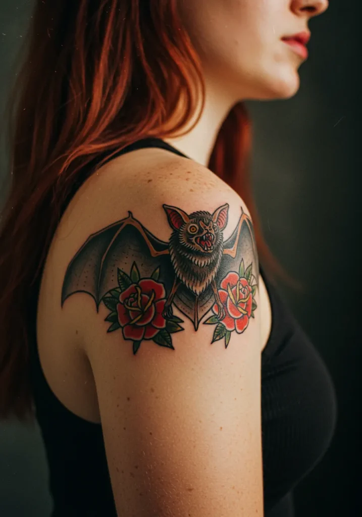 This shoulder tattoo features a dark, wide-winged bat centered between two lush red roses. The wings curve naturally around the shoulder, giving it perfect flow and symmetry. The bat s eyes glow with tiny details of orange and yellow, adding a touch of mystery against the deep black and gray tones.