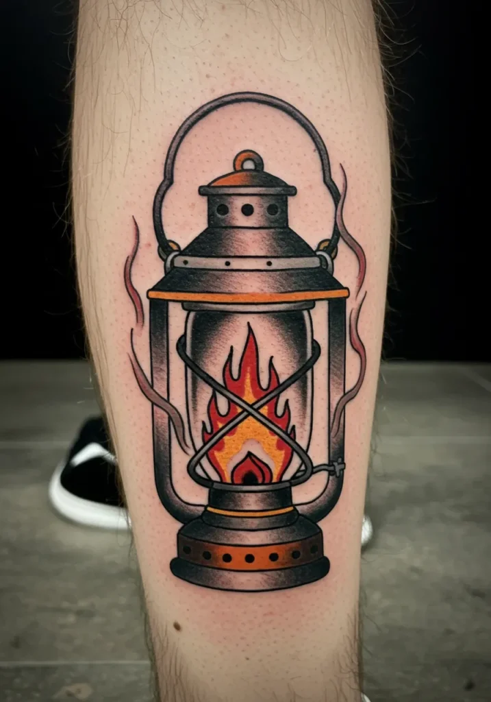 This bold calf tattoo showcases a traditional-style lantern glowing with a fiery orange and yellow flame. The solid black lines, fine stippling, and warm copper accents give it real depth and presence. The design fits the leg perfectly, balancing structure and fluid smoke details for a classic yet dramatic look.