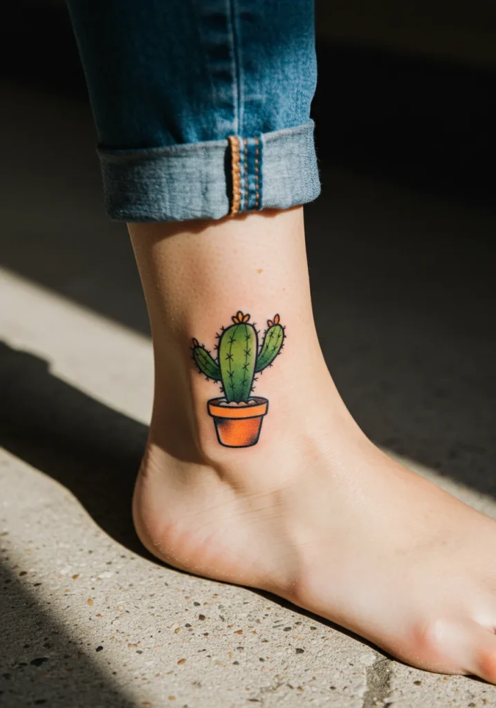 This adorable ankle tattoo shows a small cactus sitting in a bright orange clay pot, complete with tiny flowers blooming on top. The green tones are beautifully shaded, and the black outlines make the colors pop perfectly against the skin. Its compact size gives it a cheerful, minimalist look while still keeping that classic tattoo boldness.