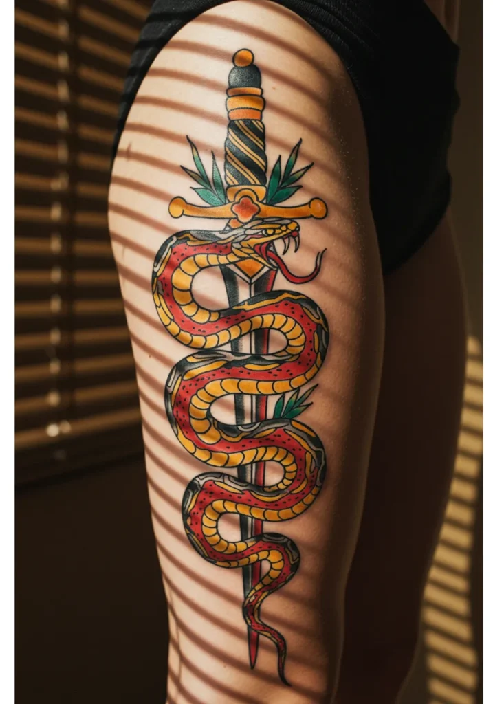 This stunning thigh tattoo features a detailed red-and-gold snake twisting around a dagger with bold green leaves at the hilt. The piece is large, perfectly following the shape of the thigh, and the deep black outlines make every color pop beautifully under warm light. It s a true American traditional masterpiece with just the right amount of bite.