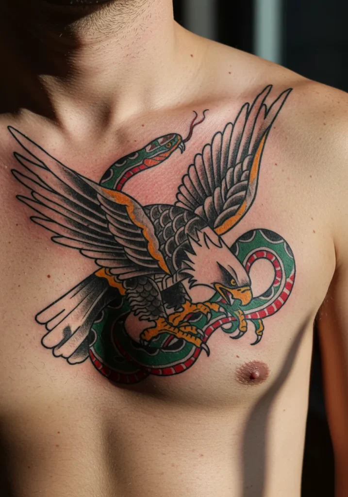 This powerful chest tattoo shows an eagle locked in battle with a snake, rendered in vibrant traditional colors like deep greens, golden yellows, and inky blacks. The wings stretch across the chest, following the natural lines of the body, while the snake s coils add motion and tension. Every feather and scale pops with bold precision.
