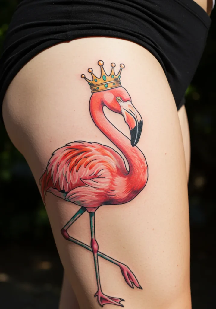 This bold thigh tattoo shows a vibrant pink flamingo standing tall with one leg gracefully bent and a golden crown perched proudly on its head. The American Traditional style shines through with clean outlines, bold shading, and a striking color palette of coral pinks, mint greens, and gold accents. The placement on the upper thigh gives it a playful yet confident vibe, and the details in the feathers make it look full of life.