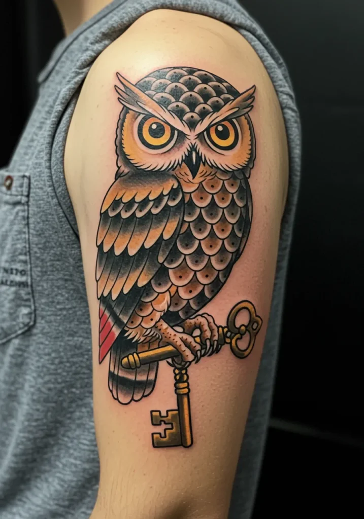 Perched high on the upper arm, this detailed owl tattoo shows the bird gripping a vintage golden key. The shading across its feathers and the mix of ochre, brown, and black tones create gorgeous contrast. It s bold, balanced, and full of personality a perfect example of old-school craftsmanship.