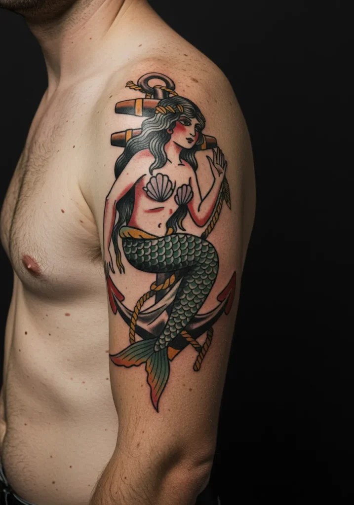 This full upper-arm tattoo blends nautical charm with a touch of fantasy. A beautiful mermaid with long dark hair rests gracefully against a golden anchor, her shimmering green tail curling elegantly around the rope. The deep reds, sea greens, and golden yellows pop beautifully, giving it that nostalgic sailor-tattoo vibe.
