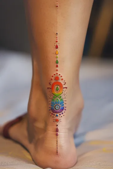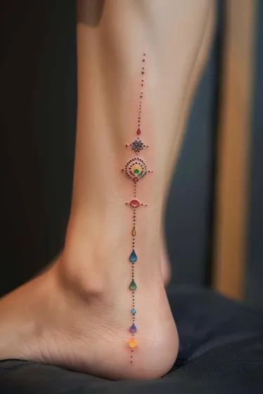 This dainty LGBTQ+ pride tattoo features a vertical string of tiny ornamental shapes and droplets in soft rainbow tones, running gracefully along the back of the ankle. Each color transitions seamlessly to the next, with fine dots connecting every element like a piece of jewelry inked right onto the skin. It has a refined and almost spiritual vibe, with tiny starburst details and gem-like accents that feel both elegant and meaningful.