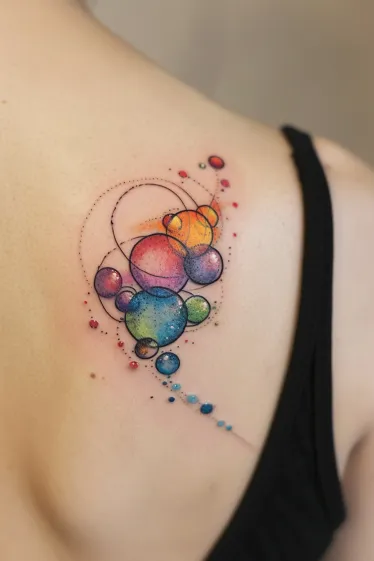 This gorgeous pride tattoo features a dreamy cluster of colorful bubbles floating across the shoulder blade. Each bubble is tinted in soft rainbow hues, from warm yellows and oranges to cool purples and blues, creating a lovely gradient effect that feels both playful and peaceful. Fine dotted lines and delicate circles connect the bubbles in a whimsical way, almost like a constellation. It s abstract, a little bit magical, and full of personality.