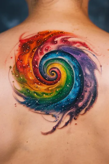 This pride tattoo is a total cosmic moment. It features a swirling spiral of vibrant rainbow colors that blend into each other like a magical storm in space. The entire design is packed with movement, sparkles, and tiny droplets that look like stars or dewdrops suspended in midair. From fiery reds to dreamy purples, every shade is bold and luminous. The placement across the upper back gives it that big wow factor while still feeling artistic and dreamy.