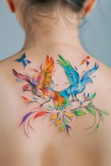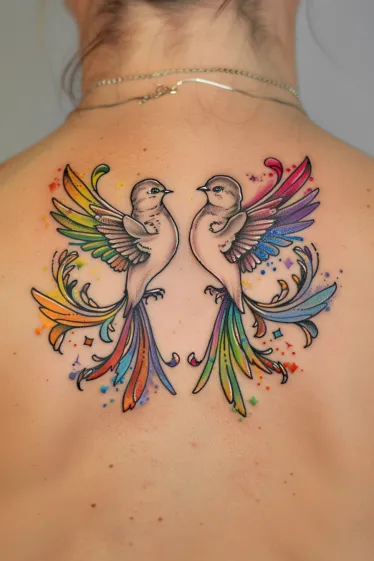 This eye-catching pride tattoo features two vibrant birds in mid-flight, surrounded by delicate rainbow feathers and playful butterflies. One bird glows in fiery reds and oranges while the other radiates cool blues and greens, creating a perfect balance of warmth and calm. The feathers scattered below feel like falling confetti, and the whole design spreads gracefully across the upper back, giving it a sense of freedom and movement that s just magical.