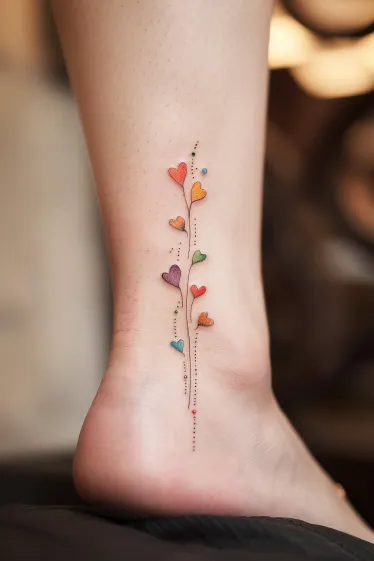 This sweet and delicate pride tattoo features a thin vine winding up the ankle, with tiny hearts in rainbow colors blooming from each stem. The hearts are painted in soft shades of red, orange, yellow, green, blue, and purple, like a little LGBTQ+ garden growing with love. Tiny dotted lines trace the path of the vine, adding a soft rhythm to the design. The placement along the ankle gives it a whimsical, dainty feel that s both feminine and meaningful.