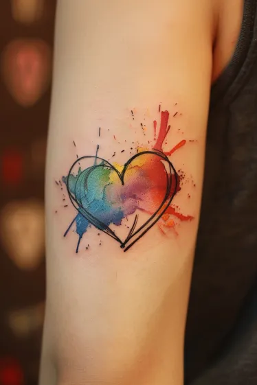This vibrant pride tattoo shows off a double-outlined heart filled with dreamy rainbow splashes that look like paint was just thrown across the skin. The mix of rich reds, greens, blues, and purples creates a beautiful blend, with little splatters extending beyond the heart like an emotional burst of color. The sketchy black lines add movement and contrast, giving it a super expressive, artsy vibe. It s placed perfectly on the upper arm, where it catches the light and feels bold without being too big.