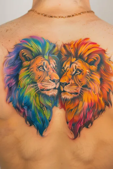 This breathtaking pride tattoo shows two majestic lions face to face, their manes flowing in opposite ends of the rainbow spectrum. One lion glows in cool shades of blue, green, and violet, while the other burns bright with warm tones of red, orange, and yellow. They re placed beautifully on the upper back, almost like a mirror of balance, strength, and connection. The detailing is so lifelike, and yet the color play gives it a dreamy, artistic edge.