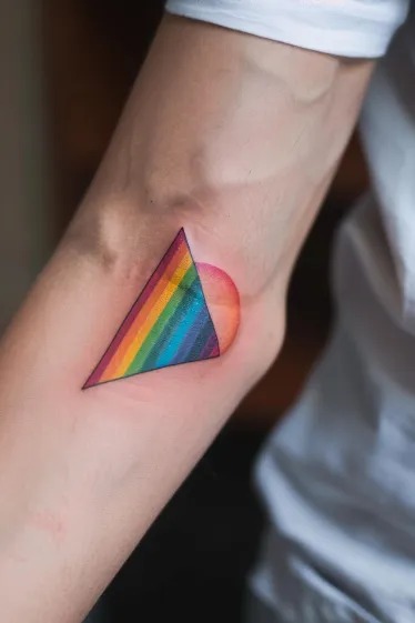 This minimalist pride tattoo features a sleek triangle filled with vibrant rainbow stripes, tilted slightly and paired with a soft orange-pink circle that resembles a glowing sun. The clean lines and bold colors give it a super modern look, while the placement near the inner elbow makes it feel just a little edgy and unexpected. It s compact, but it totally stands out with that gorgeous mix of geometry and color.