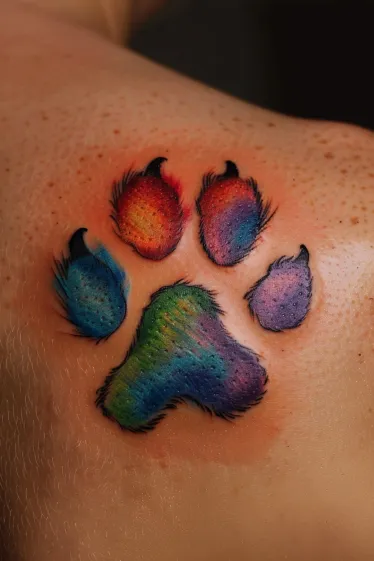 This playful LGBTQ+ tattoo features a bold and colorful paw print, made entirely of soft, furry rainbow hues. Each toe pad is tinted in a different vibrant shade, from fiery red and orange to deep blue and purple. The texture gives the impression of actual fur, which makes it feel warm and full of personality. It s placed on the shoulder in a way that feels spontaneous and expressive, like a little stamp of joy and identity.