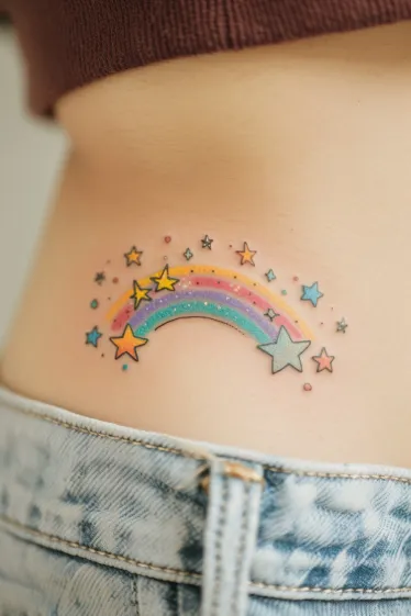 This adorable lower back tattoo features a pastel rainbow arched with soft shades of pink, orange, yellow, green, and blue. Surrounding the rainbow is a magical sprinkle of colorful stars in varying sizes, giving it a dreamy, cosmic vibe. The lines are clean and playful, and there s just the right amount of sparkle to make it feel like it came straight out of a fairytale. It s small, sweet, and full of personality.