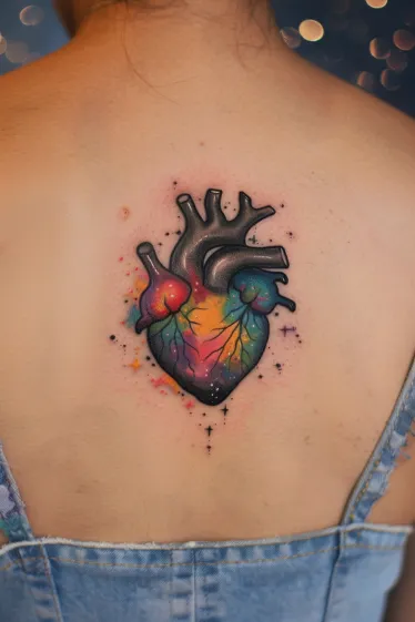 This bold pride tattoo features a realistic anatomical heart brought to life with a stunning rainbow gradient across the lower half. The arteries and veins pop in inky black with subtle highlights, while the vibrant blend of reds, oranges, yellows, greens, and purples pulses through the center like it s lit from within. A soft spray of watercolor stars adds a dreamy background effect that balances out the bold black shading with a little magic and sparkle.