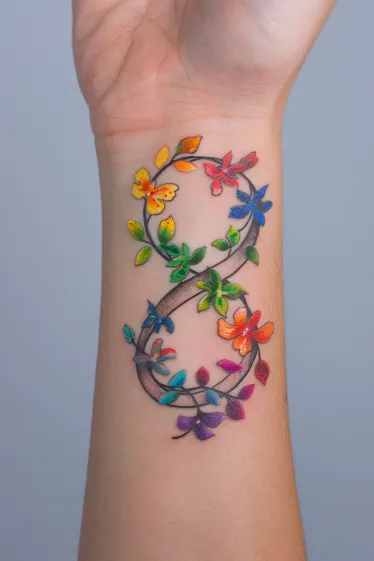 This gorgeous LGBTQ+ pride tattoo features an elegant infinity symbol made of two intertwined branches, gracefully looping across the wrist. Tiny rainbow-colored leaves and flowers bloom all along the shape, creating a soft yet colorful pattern that wraps around the design like a floral crown. Each petal is inked in bright shades of the rainbow, making the whole tattoo feel full of life and joy. The wrist placement is perfect for something meaningful and eye-catching without being too loud.