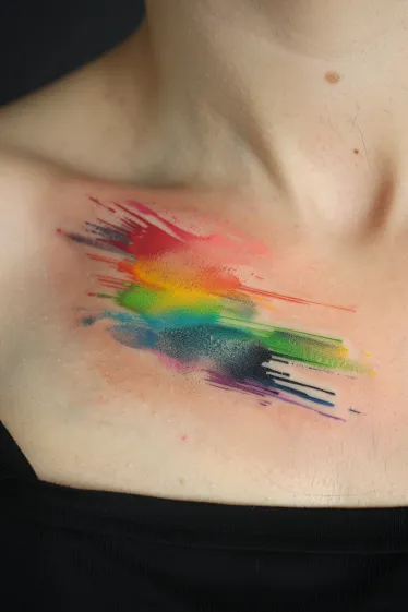This pride tattoo looks like a brushstroke straight off an artist s canvas. Positioned just below the collarbone, it features bold streaks of rainbow color in a watercolor style that feels expressive and wild in the best way. The edges blur and drip slightly, like the ink is still drying, adding a splash of spontaneity to the design. It s abstract, fierce, and totally unapologetic.