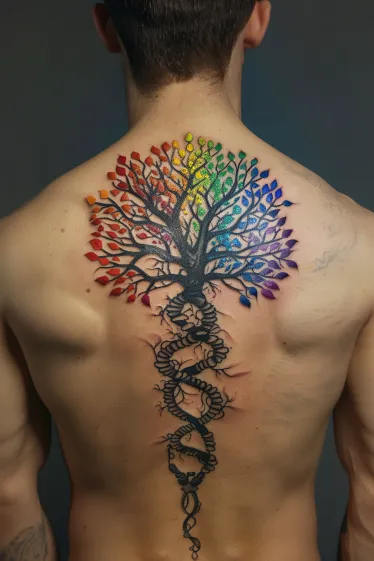 This jaw-dropping pride tattoo spans the full length of the back and features a powerful tree of life with roots formed by two coiling serpents. The branches stretch wide across the shoulders, bursting with leaves in a full rainbow spectrum that celebrates the beauty of LGBTQ+ pride. The contrast between the deep black roots and the colorful crown creates a dramatic visual that feels both grounded and radiant. Every detail is sharp, intricate, and symbolic.