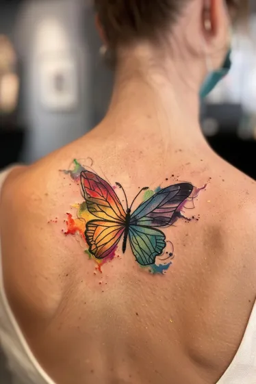 This gorgeous back tattoo features a butterfly that s been kissed by every shade of the rainbow. Its delicate wings are outlined in fine black ink, while the insides burst with watercolor blends of red, orange, yellow, green, blue, and purple. The edges of the colors softly fade into each other, almost like a dreamy splash of ink that happened to land in the perfect butterfly shape. It s fluid, vibrant, and full of movement, like the wings are about to flutter.