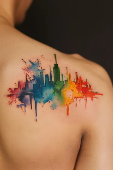 his bold and artsy pride tattoo features a dramatic city skyline stretching across the upper back and shoulder, with buildings silhouetted in crisp black ink. Behind the skyline, a stunning burst of rainbow watercolor spills from one end to the other, blending deep purples into fiery oranges like the sun just set on the most fabulous day ever. The paint-drip effect adds that perfect touch of movement and messiness that makes the whole design feel alive and full of personality.