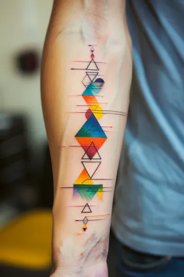 This bold and edgy LGBTQ+ pride tattoo features a striking line of triangles and diamonds stacked vertically down the forearm. Each shape is filled with rich splashes of rainbow color, blending into each other like a modern watercolor painting. Sharp black outlines and minimalist lines balance the softness of the colors, giving the whole piece a clean, contemporary vibe. It s abstract, artsy, and so full of personality.