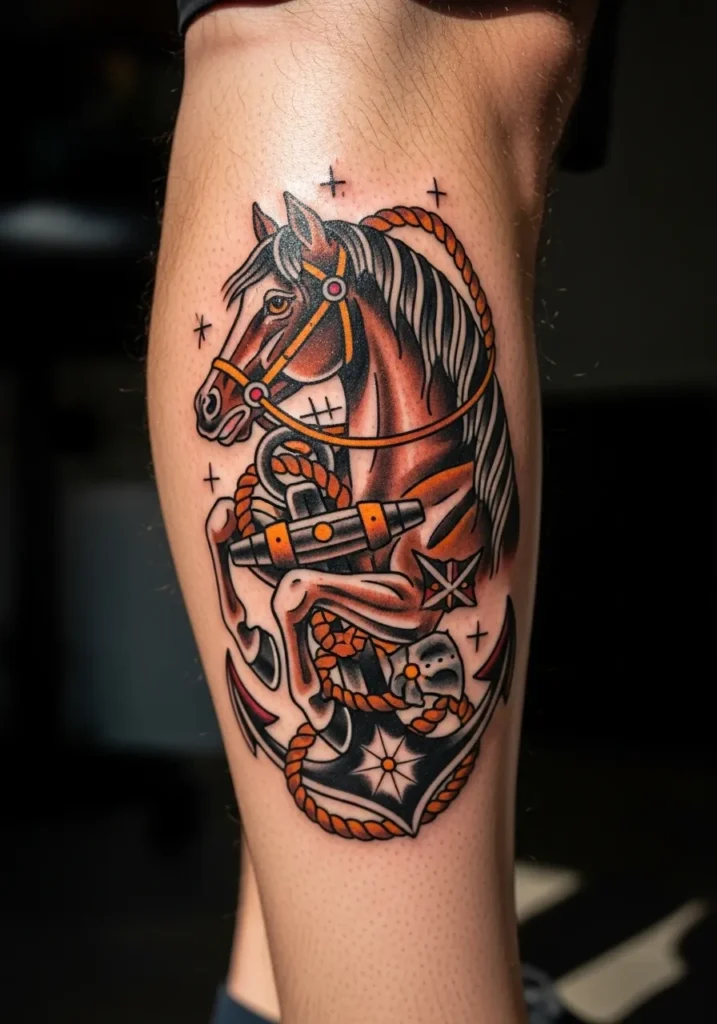 This lower leg tattoo is packed with personality. It combines a proud horse s head with a large anchor, ropes, and small star details all shaded in warm browns, oranges, and blacks. The mix of equestrian and nautical motifs gives it a rugged, adventurous vibe.