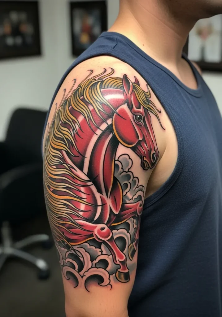 This stunning shoulder piece features a red horse in motion, surrounded by swirling black and gray clouds. The bright yellow mane brings life and movement to the design, while the bold lines keep it true to classic American traditional style.