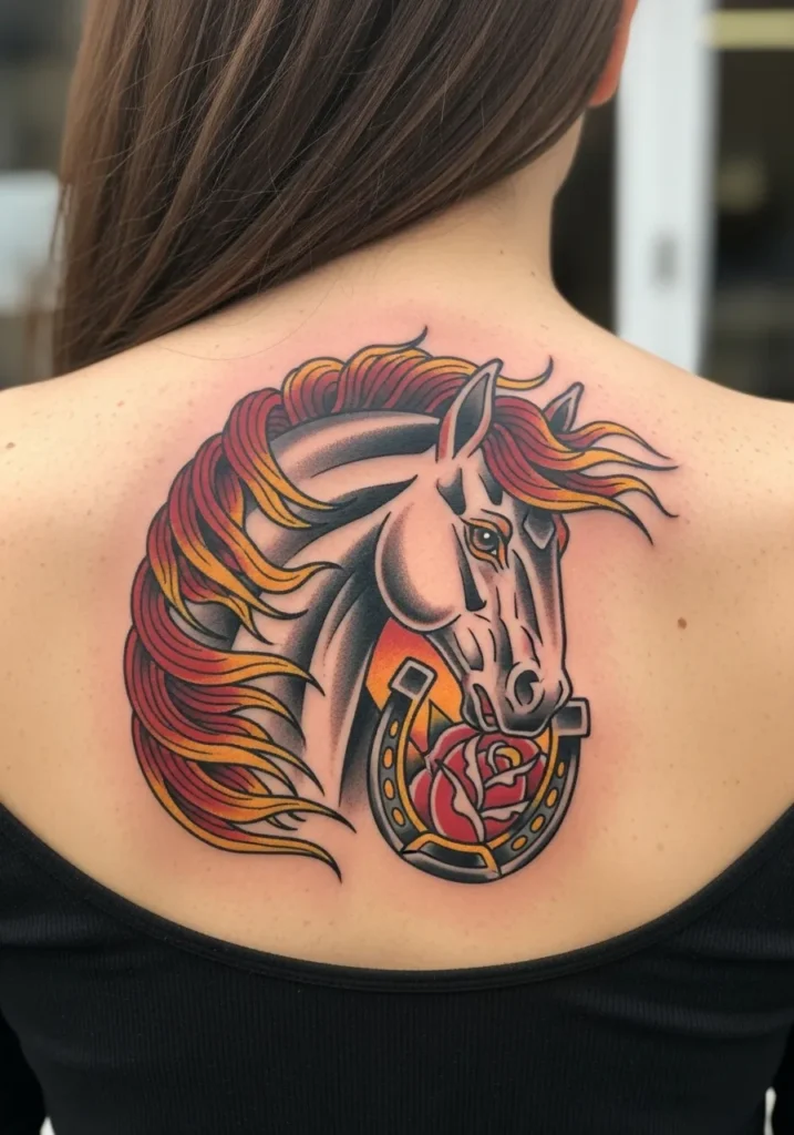 This stunning American traditional horse tattoo covers the upper back, centered perfectly between the shoulder blades. It features a detailed white horse framed by flowing red and orange mane that almost looks like flames. A golden horseshoe encircles a red rose beneath the horse, tying the whole design together with warmth and movement.