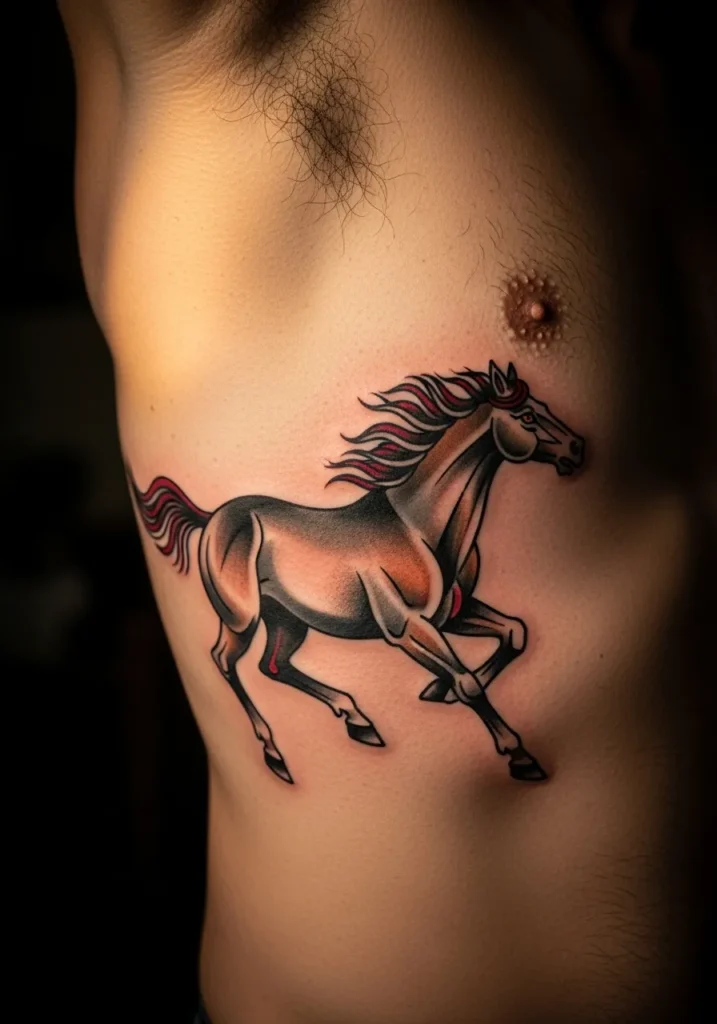 Placed along the ribcage, this medium-sized tattoo shows a galloping horse in motion. The shading blends soft browns, blacks, and reds, giving it a lifelike sense of movement. The minimal background makes the horse s muscles and flowing mane the star of the design.