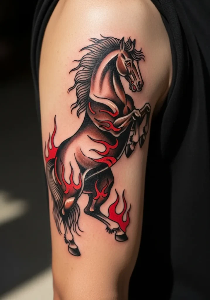 This upper arm tattoo shows a rearing horse surrounded by red flames, all drawn in the bold lines and rich shading that define American traditional style. The muscular form and flowing mane give it a strong sense of movement and energy.