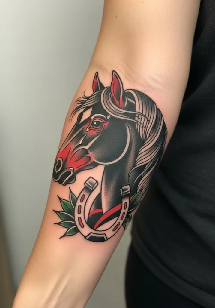 This American traditional design covers the outer forearm, showcasing a horse s head surrounded by a lucky horseshoe and green leaves. The colors deep black, red, and soft green create that classic old-school charm that never fades. The detailing around the mane and eyes adds a touch of softness to the powerful look.