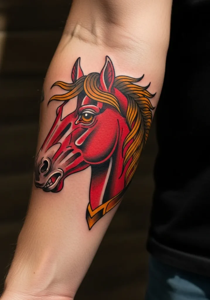 This bright red horse tattoo sits beautifully on the forearm, with golden accents running through the mane and around the collar. The shading is smooth, giving the design a polished, glossy finish. The placement makes it visible and bold, the kind of piece that stands out even from afar.