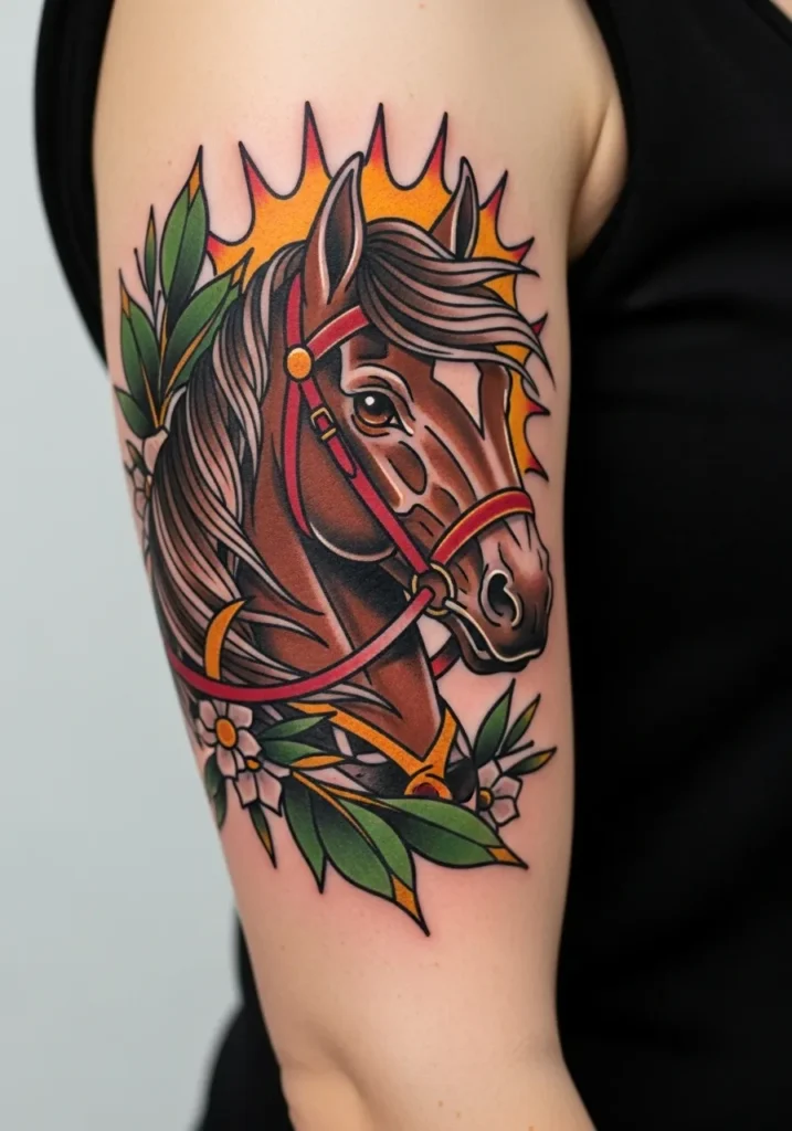 This vibrant tattoo on the upper arm blends classic bold outlines with floral accents. The horse s face is framed by green leaves and pink flowers, with warm brown tones and pops of gold adding a soft feminine touch.