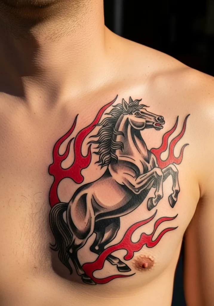 I can t help but love how alive this tattoo feels. It s bold and full of attitude, like the horse is bursting straight out of your chest. It feels like a symbol of passion, fire, and unstoppable willpower.