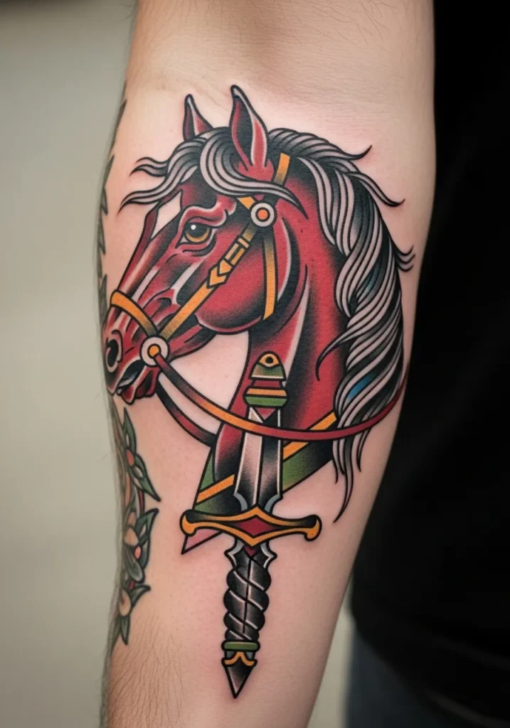 This tattoo on the upper arm pairs a red horse head with a sword running vertically beneath it. The design is shaded with rich tones of red, gold, and green, while the bold black outlines give it that classic American traditional punch. The placement along the arm makes it feel like a warrior s mark strong, confident, and perfectly framed by the skin.