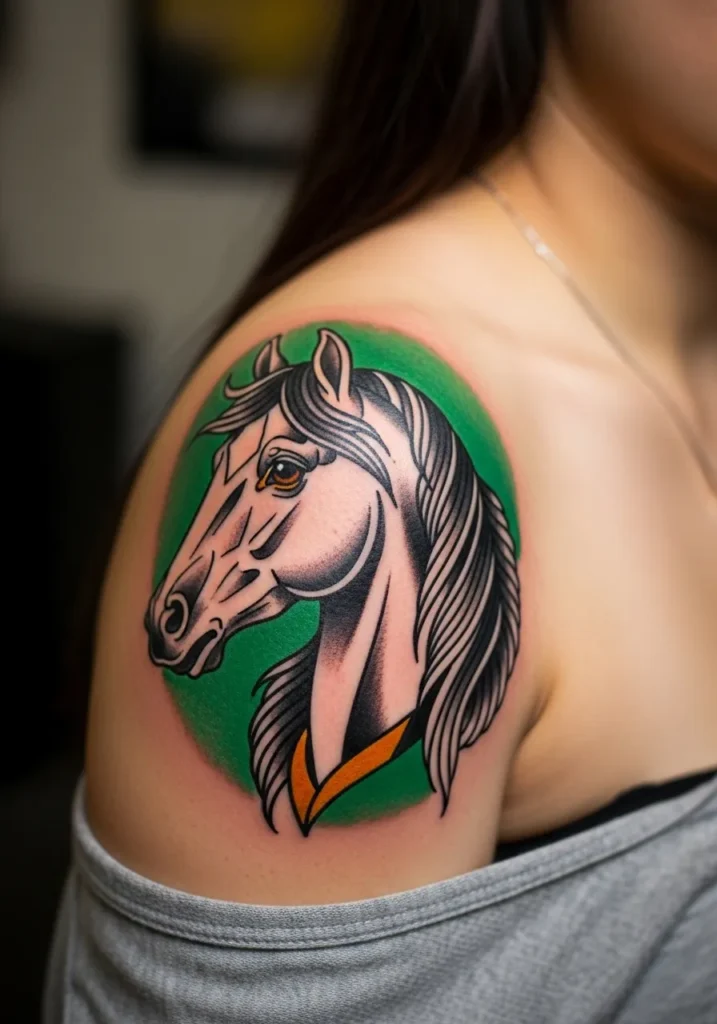 Set on the shoulder, this tattoo features a light-colored horse s head surrounded by a glowing green background. The contrast between the pale shading of the horse and the bright green backdrop gives it a soft yet striking effect.