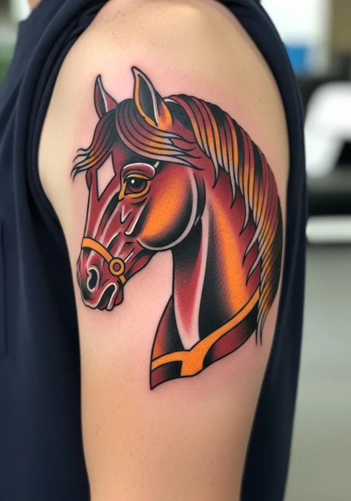 This classic upper arm tattoo highlights a warm red horse with golden accents running through the mane and bridle. The shading is soft yet vibrant, and the colors flow together beautifully to create that unmistakable American traditional richness.
