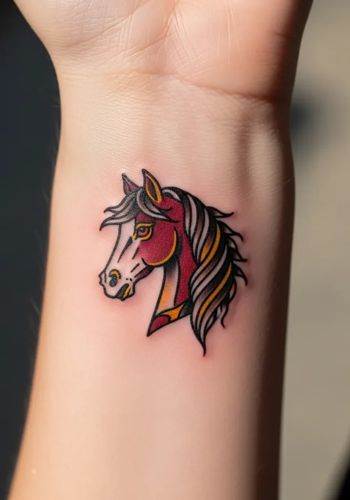 This tiny tattoo on the inner wrist features a horse s head in deep red tones with golden highlights. The bold lines and careful shading make it pop despite its small size, giving it that classic old-school charm even in miniature form.