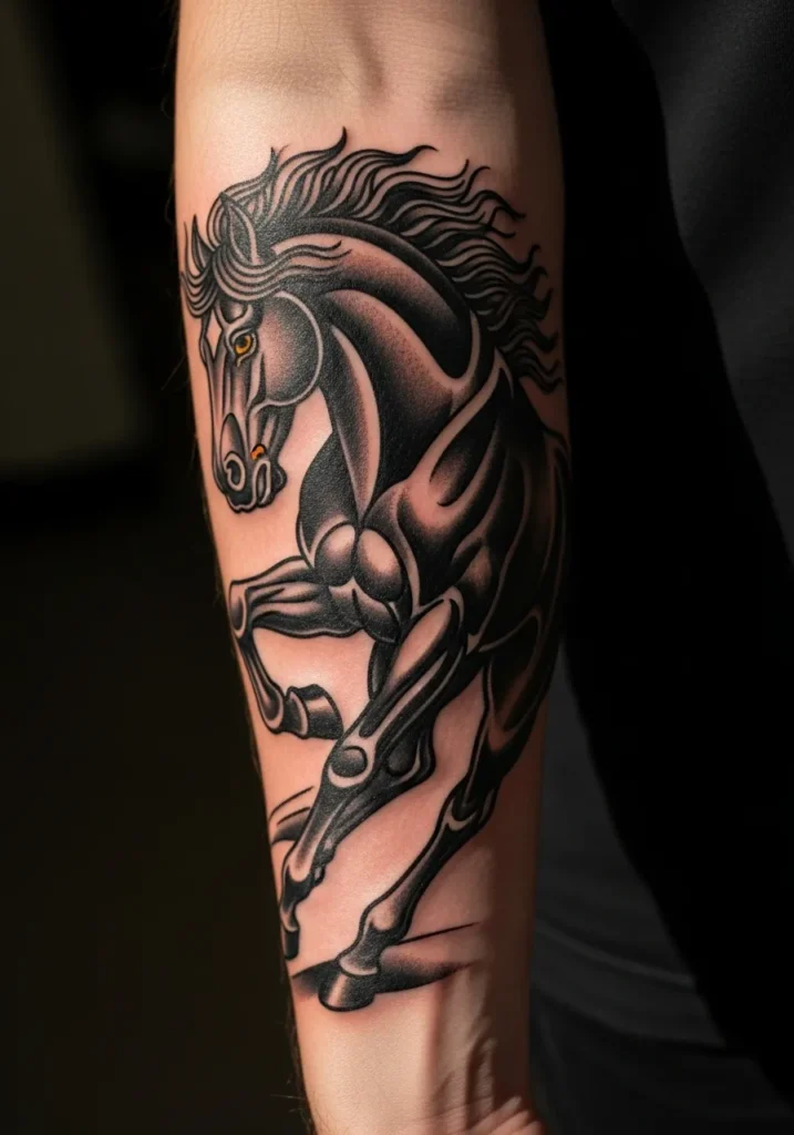 This monochrome horse tattoo on the forearm is pure old-school style. It features a muscular horse in motion, shaded entirely in black and gray with clean, bold lines. The placement makes it perfect for showing off strength and movement every time you turn your arm.