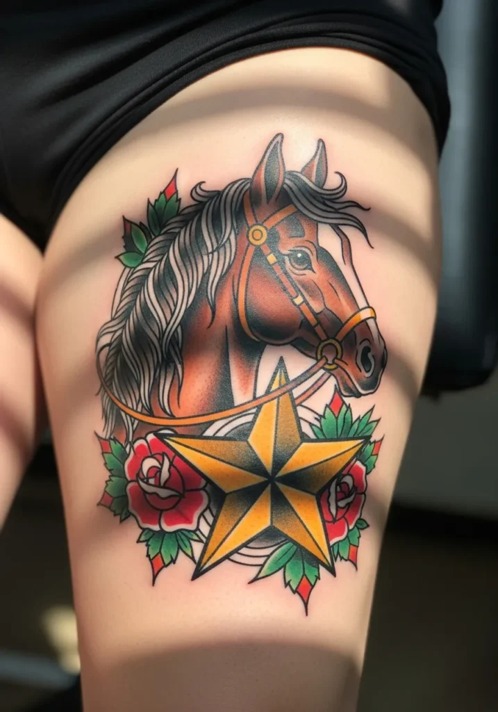 This striking American traditional horse tattoo sits on the upper thigh, combining a brown horse head with a golden five-pointed star and vibrant red roses. The colors are rich and bold, with soft black shading and crisp outlines that give it a polished, timeless look. The placement makes it eye-catching yet easy to conceal, perfect for those who like a bit of mystery with their ink.
