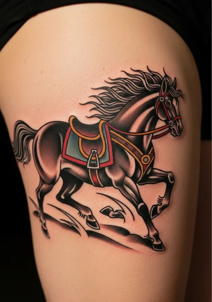 Every time I see a horse tattoo done in the bold American traditional style, it feels like it carries that same energy. Strong lines. Fierce spirit. A little vintage attitude.