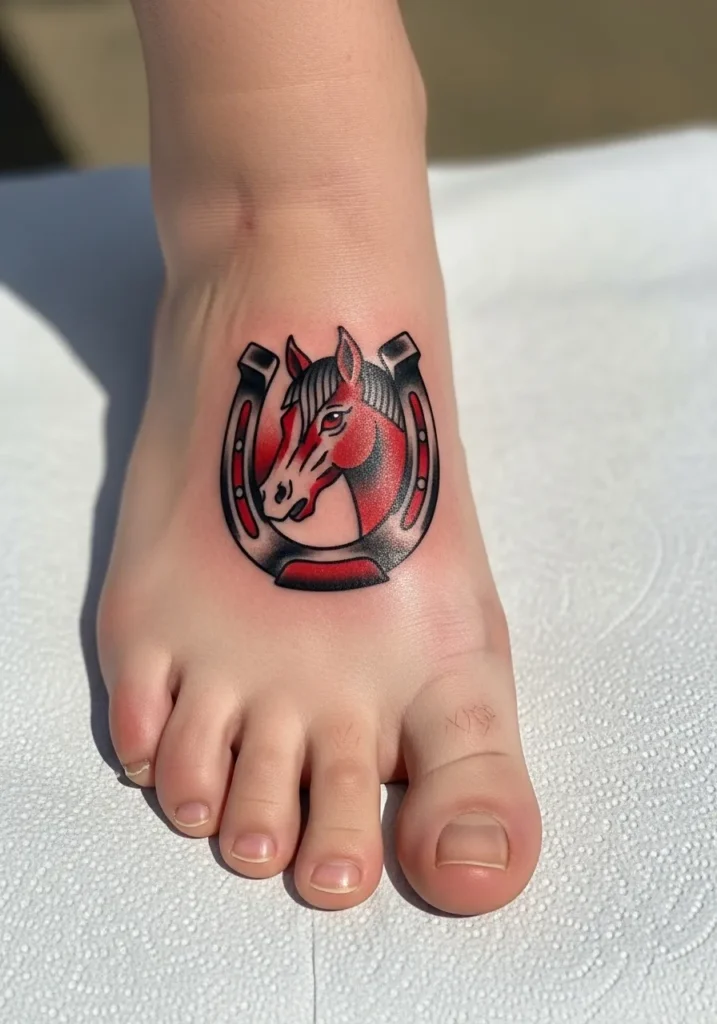 This cute foot tattoo features a red horse head framed by a black and red horseshoe. The design is small but punchy, using bold lines and classic color tones that pop against the skin. It s placed perfectly to show off when barefoot or in sandals, giving it a playful touch.