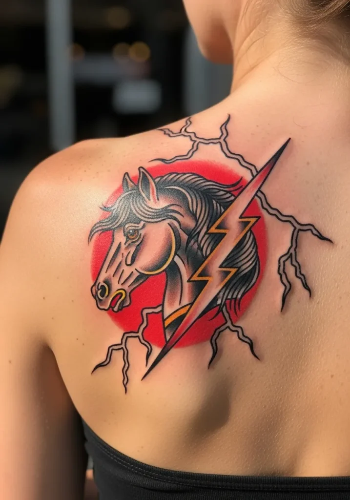 This bold shoulder tattoo shows a horse head set against a bright red circular background, split by a striking yellow lightning bolt. Black lightning lines extend outward, adding extra energy and movement to the piece. The design glows under sunlight and sits beautifully along the upper back.