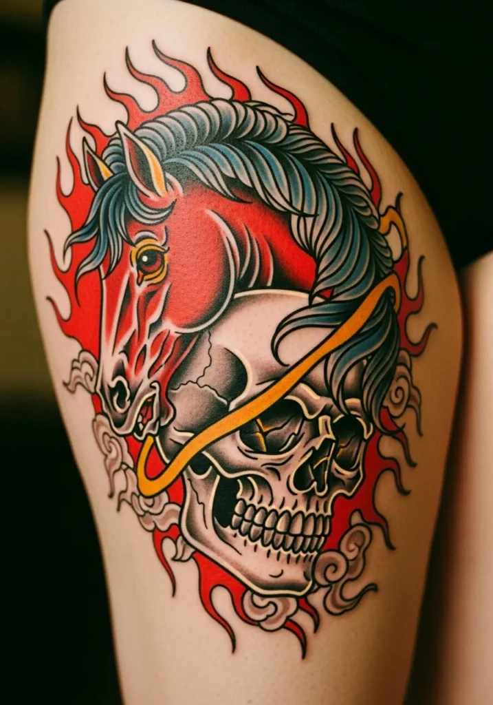 This dramatic thigh piece blends a fierce red horse head with a skull, surrounded by swirling flames and smoke. The details are sharp, the colors vibrant, and the entire tattoo feels like a bold statement of strength and mortality. The yellow reins that connect both figures add the perfect finishing touch.