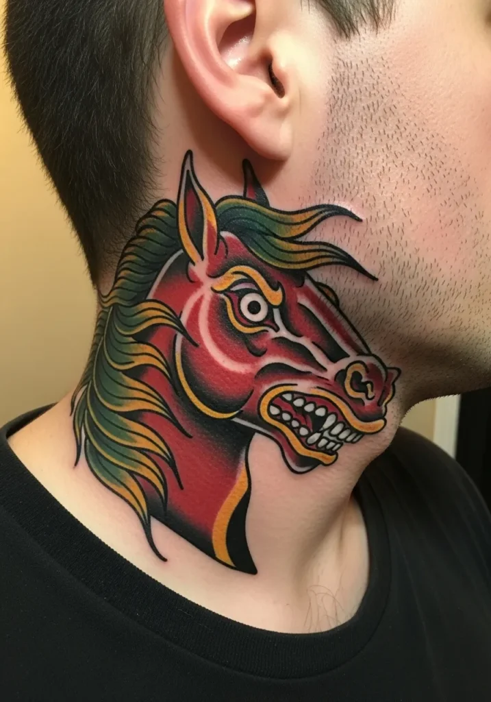 Placed on the side of the neck, this tattoo is impossible to ignore. The horse s head bursts with attitude, painted in intense red with striking yellow and green highlights. Its bared teeth and flared nostrils give it a wild, fearless energy that fits perfectly with the boldness of the placement.