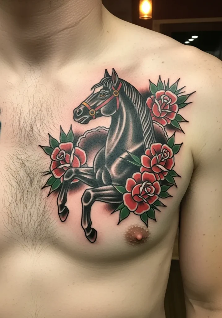 This large chest tattoo shows a black stallion surrounded by blooming red roses. The deep black shading contrasts beautifully with the warm greens and reds of the flowers, giving it that perfect American traditional balance. The design flows naturally across the chest, following the body s shape for a bold, masculine yet elegant result.