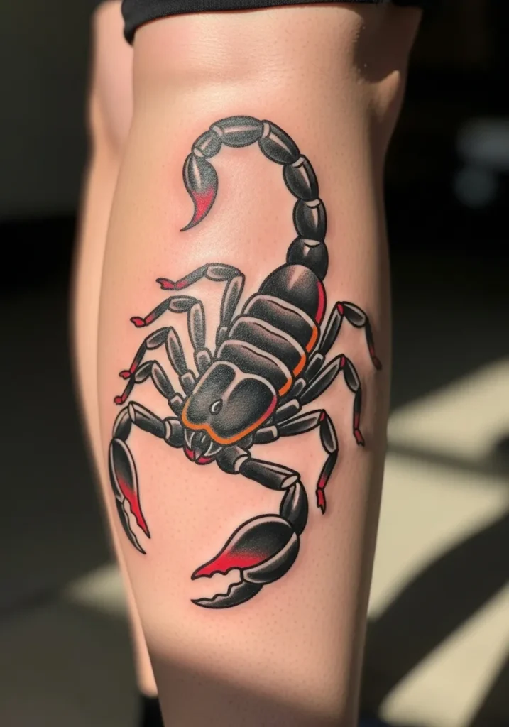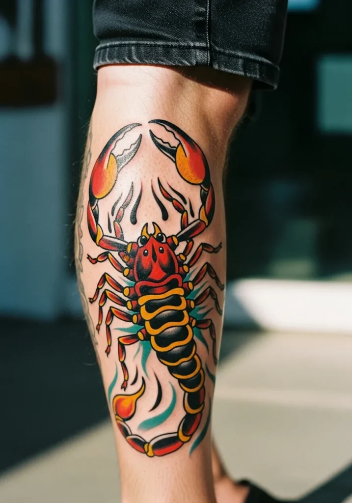 This striking tattoo on the calf features a large red and yellow scorpion framed by subtle flame-like designs. The bright color gradients and crisp black lines give it that unmistakable American Traditional punch. The vertical layout hugs the leg perfectly, giving it a sleek yet commanding presence.