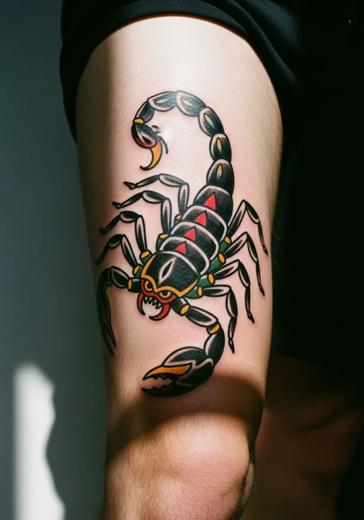 This large thigh tattoo shows off a classic American Traditional scorpion with solid black shading, red accents, and a touch of yellow for contrast. The placement flows perfectly with the curve of the thigh, creating a design that feels bold but also incredibly flattering.