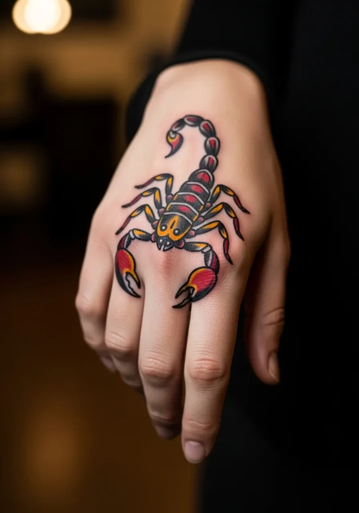 This American Traditional scorpion tattoo sits right on the hand, instantly drawing attention with its sharp outlines and bold colors. The mix of deep black, red, and yellow gives it that classic old-school punch, while the compact size keeps it neat and wearable. The placement across the hand bones makes it look like the scorpion is crawling right over the skin.
