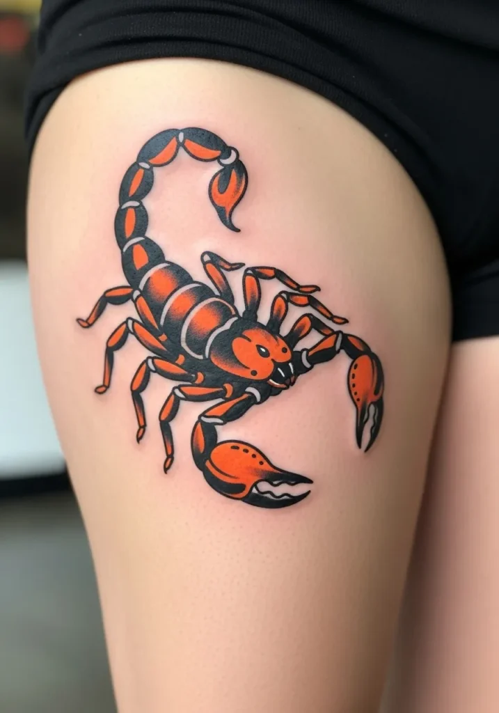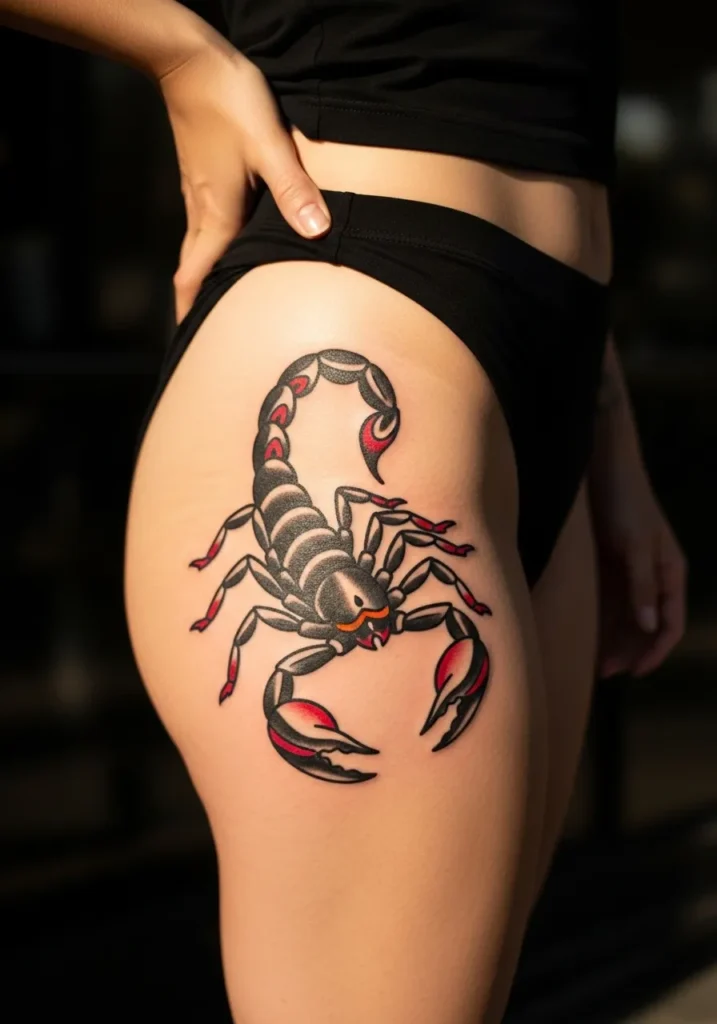 This thigh tattoo showcases a beautifully detailed American Traditional scorpion in shades of black, red, and orange. The bold lines make it stand out, while the placement emphasizes the natural curves of the body for a striking and balanced look.